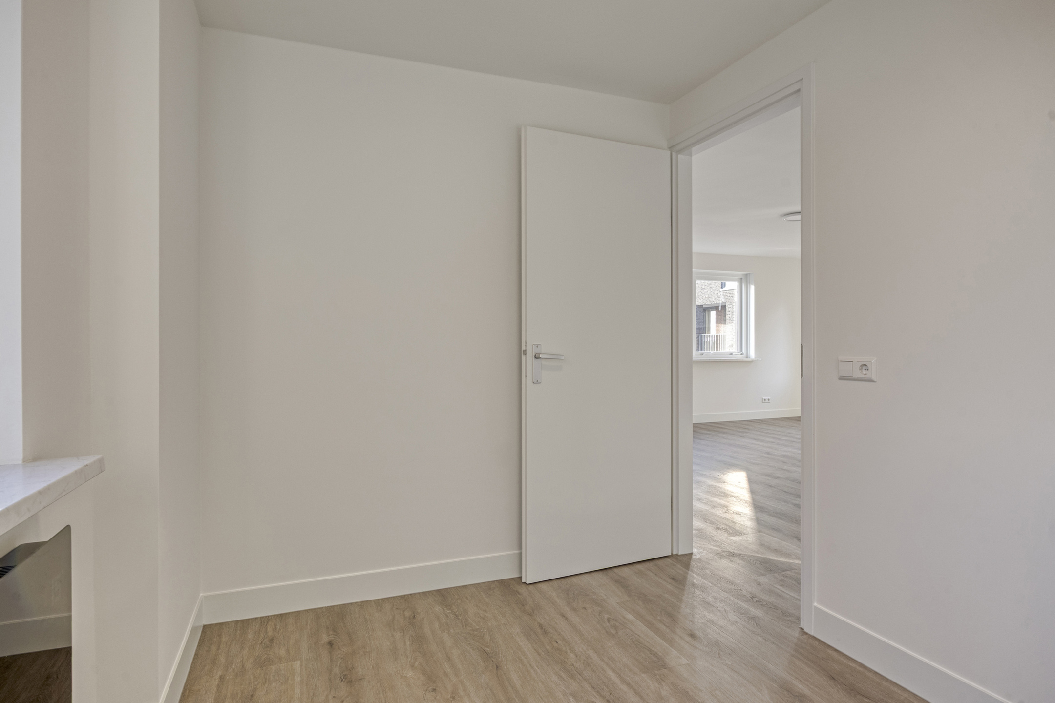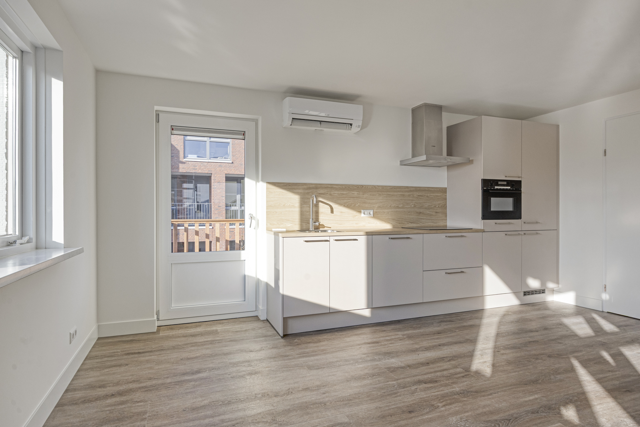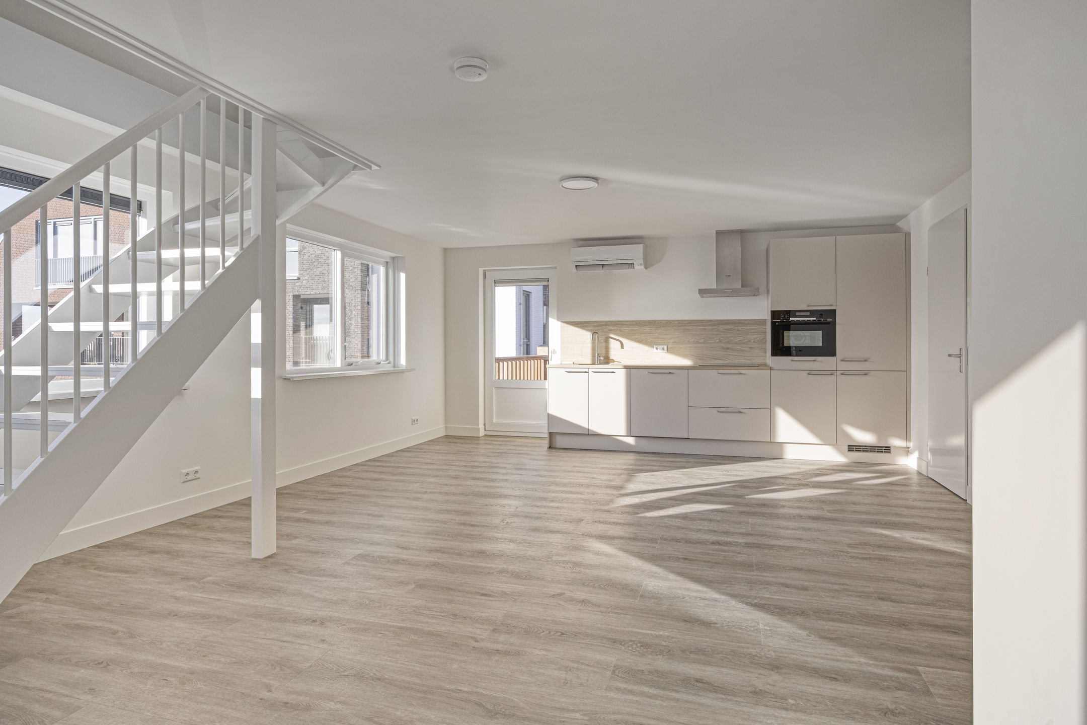 De lichte woonkamer met open keuken vormt het hart van het appartement. Deze ruimte is voorzien van airconditioning voor zowel verwarming als koeling.