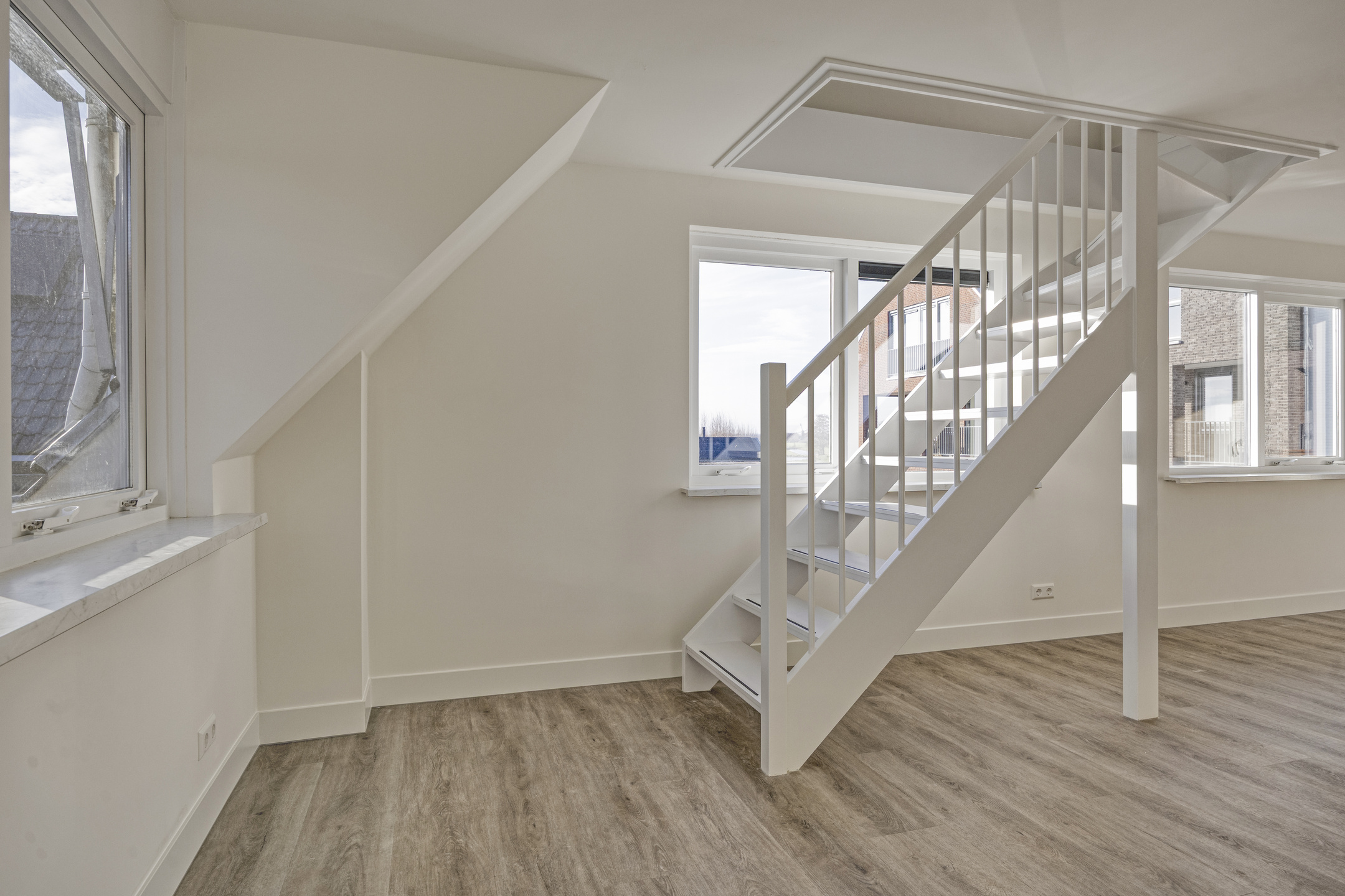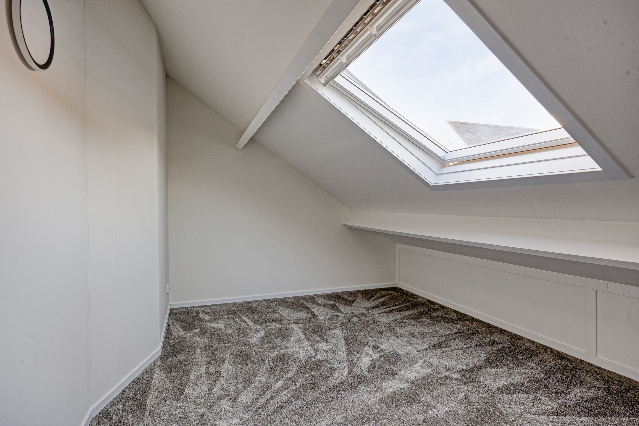 Op de tweede verdieping bevindt zich een ruime overloop met witgoedaansluitingen. Hier vindt u twee volwaardige slaapkamers, beide voorzien van dakramen en airconditioning voor verwarming en koeling. De gehele verdieping is afgewerkt met vloerbedekking, wat zorgt voor een warme en rustige uitstraling.