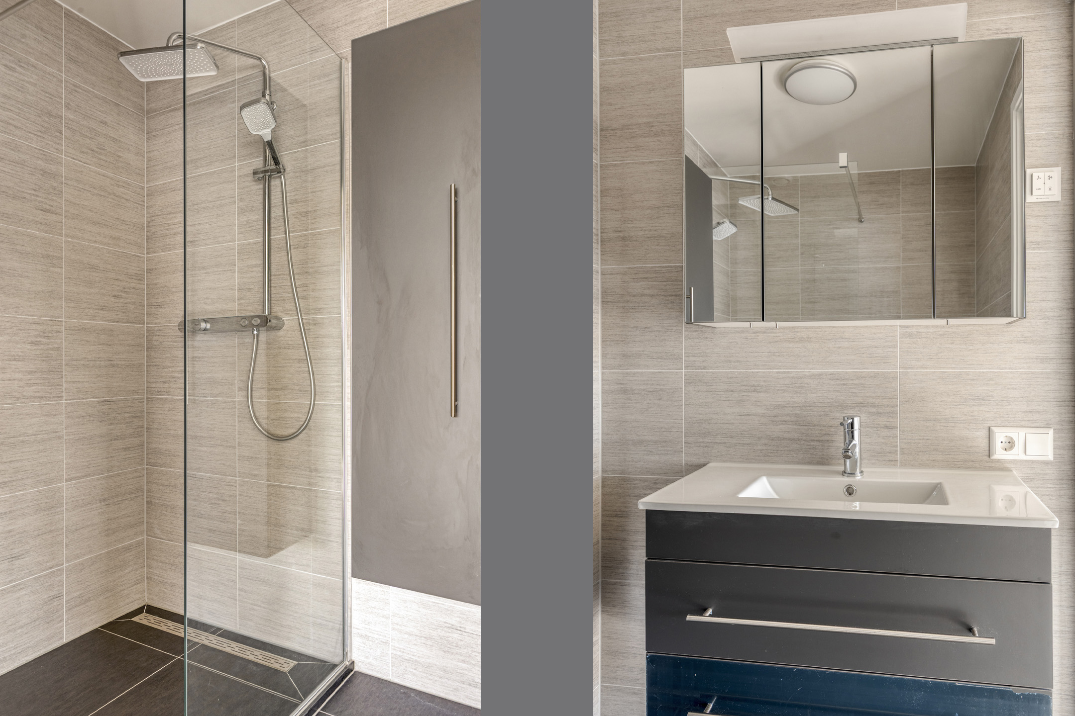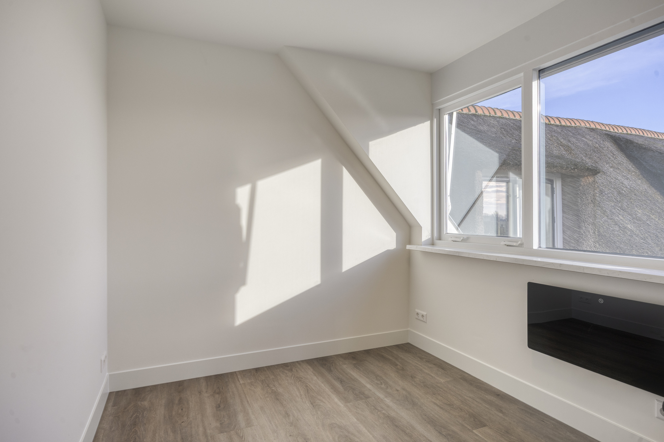 Verder bevindt zich op deze verdieping een slaap-/werkkamer, voorzien van elektrische verwarming, en een strak afgewerkte badkamer met inloopdouche en wastafelmeubel, geheel betegeld in een eigentijdse stijl.